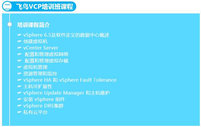 飞鸟作为VMware在江苏区域的“VMware授信培训中心”,将于4月上旬在苏州推出为期 5 天的“VMware vSphere: Install, Configure, Manage [V6.5]”(以下简称 VCP)基础培训班,VMware培训团队认证讲师,直连美国原生实验中心,五天高品质课程保证!你们还在等什么?!