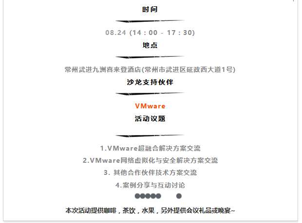 飞鸟主办的苏南IT技术沙龙【常州站】将于8月24号(周五)举办。本次交流会特邀的VMware专家将围绕“企业新一代虚拟化数据中心及私有云规划”这一主题,和大家分享超融合架构、网络虚拟化、桌面虚拟化等方面的最新技术方案及实用实践经验。如果大家有遇到相关的问题可以提前准备好,到时与专家们现场一起探讨。