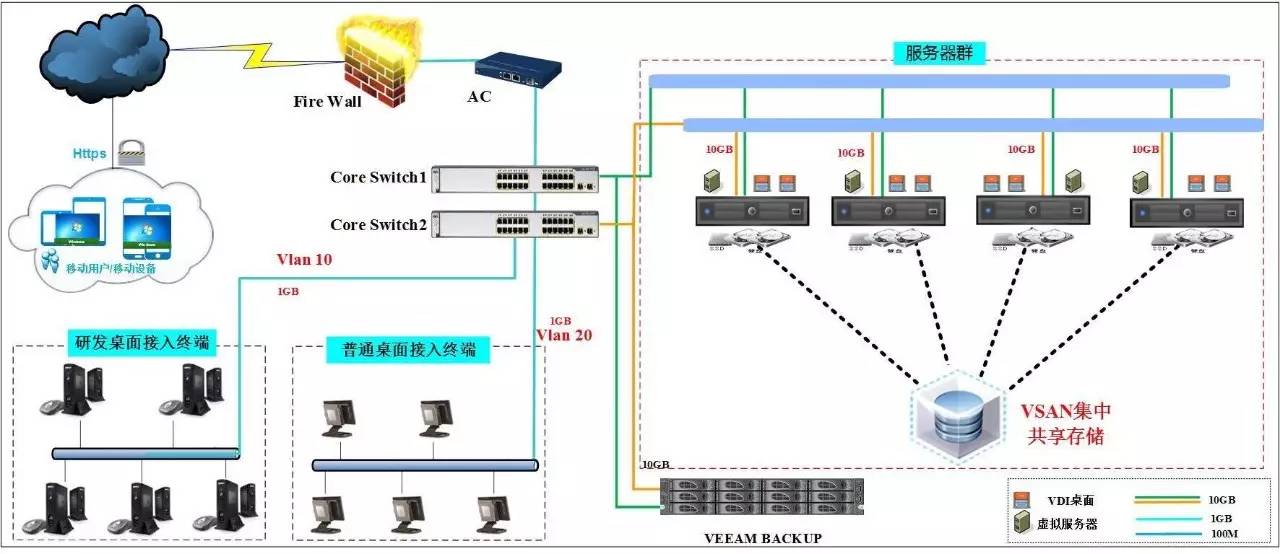 同时针对常见办公桌面虚拟化场景,可以基于VSAN存储架构构建桌面虚拟化解决方案,VSAN+VIEW+HP瘦客户机组合