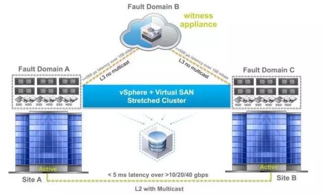 VSAN能够在2个数据中心分开部署,结合第三元数据站点仲裁,构建VSAN的延伸群集,实现存储的双活架构。
