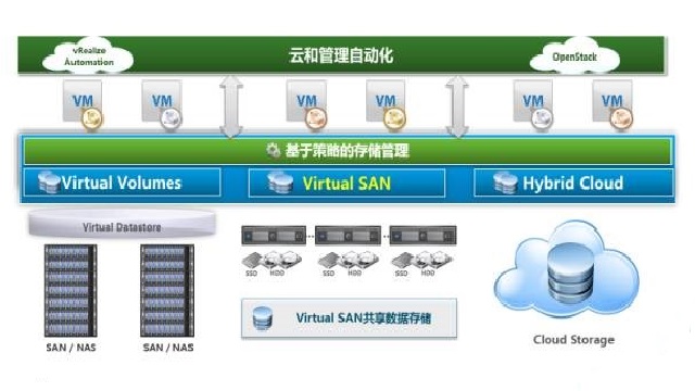 VSAN与Datacore等SDS厂商类似,把控制器内封闭的存储管理软件独立出来,管理平面与数据平面完全分离,不同的是,VSAN采纳分布式对象存储架构,同时其存储资源管理平台SPBM可扩展延伸管理VVOL卷及更多存储对象。