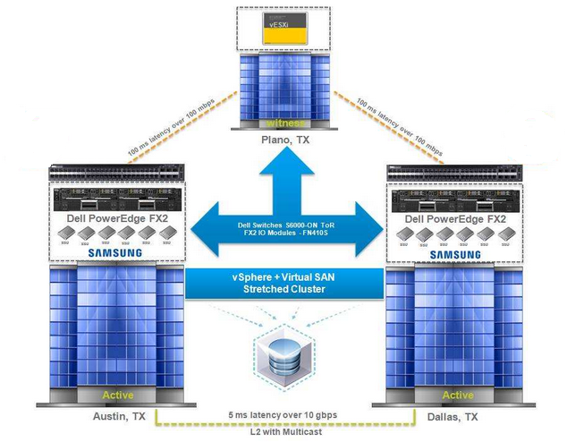可伸缩集群和vSphere复制配合起来,可以实现两地三中心的部署。利用VSAN最新的快照技术,可以实现5分钟的RPO。