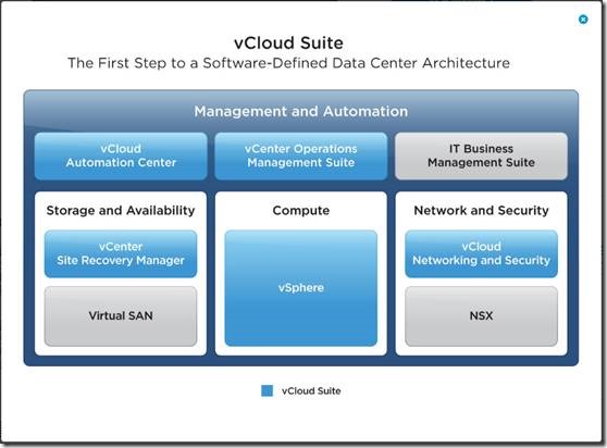 VMware私有云解决方案以VMware vCloud Suite为基础。借助与VMware vSphere中相似的抽象化功能,能够将虚拟化提升到数据中心级别。IT服务以完全封装且可移动的多虚拟机单元形式交付,这些单元可存储在服务目录库中,并可迁移到任何与VMware兼容的云。