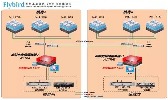 采用三台DataCore SANsymphony-V存储服务器来组建关键业务存储高可用及数据灾难备份与恢复系统。生产数据中心采用两台采用DataCore存储服务器来形成存储高可用保护,使用光纤磁盘阵列作为在线存储系统,以保证生产系统的读写性能;灾备数据中心采用外接盘柜作为数据备份目标,以降低整体成本。